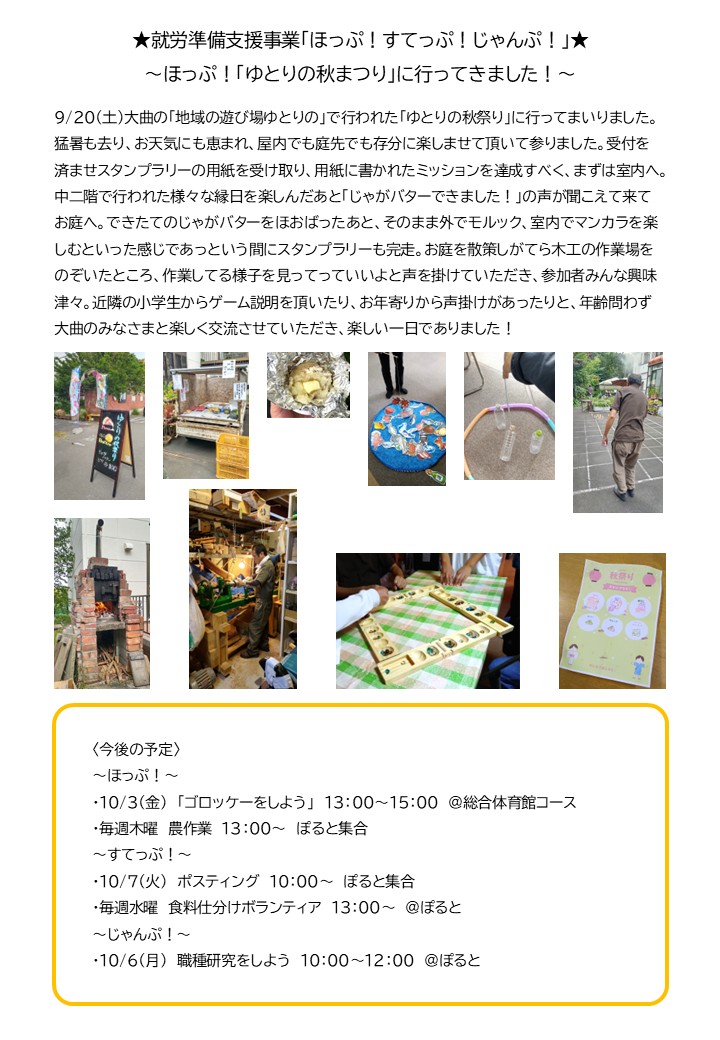 ★就労準備支援事業「ほっぷ!すてっぷ!じゃんぷ!」★~ほっぷ!「ゆとりの秋まつり」に行ってきました!~